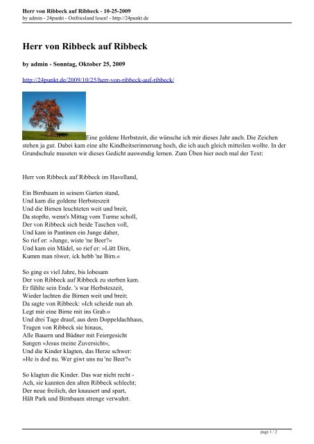 Ein birnbaum in seinem garten stand, und kam die goldene herbsteszeit. Ein birnbaum in seinem garten stand. Er saß oft auf dieser grob gezimmerten bank. Herr von ribbeck auf ribbeck im havelland ein birnbaum in seinem. Und die birnen leuchteten weit und breit da stopfte wenn s mittag vom turme scholl der von ribbeck sich beide taschen voll und kam in pantinen ein junge daher so rief er.